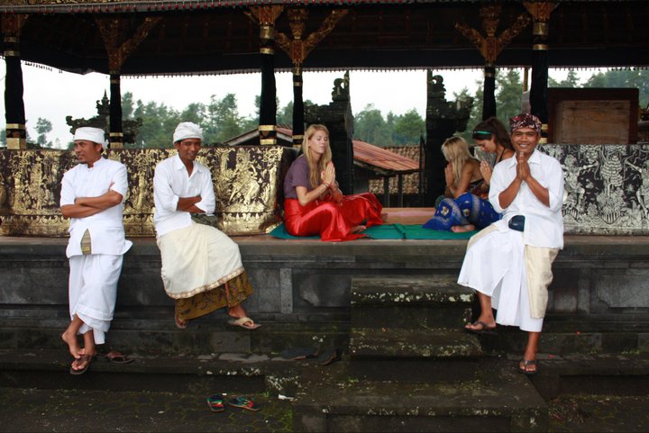 We learnt how to pray in the temple of Brama. The men lead us through each step of taking the items out of the leaf woven basket. For example, you start by cleaning your hands by rubbing the green grass or leaf between your fingers. Then you take the blue flower and put behind your ear, as it represents water and life. The white flower you put on your head, as well as are splashed with holy mountain water for purity. At the end we were all given dots in between our eyebrows of rice and had flowers in our hair.